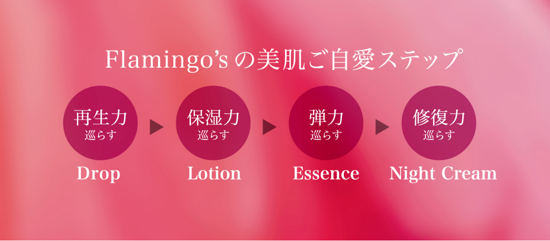 Flamingo’sのコスメラインは、ヒト幹細胞培養液をたっぷり配合し、巡りに着目した全4アイテムです。